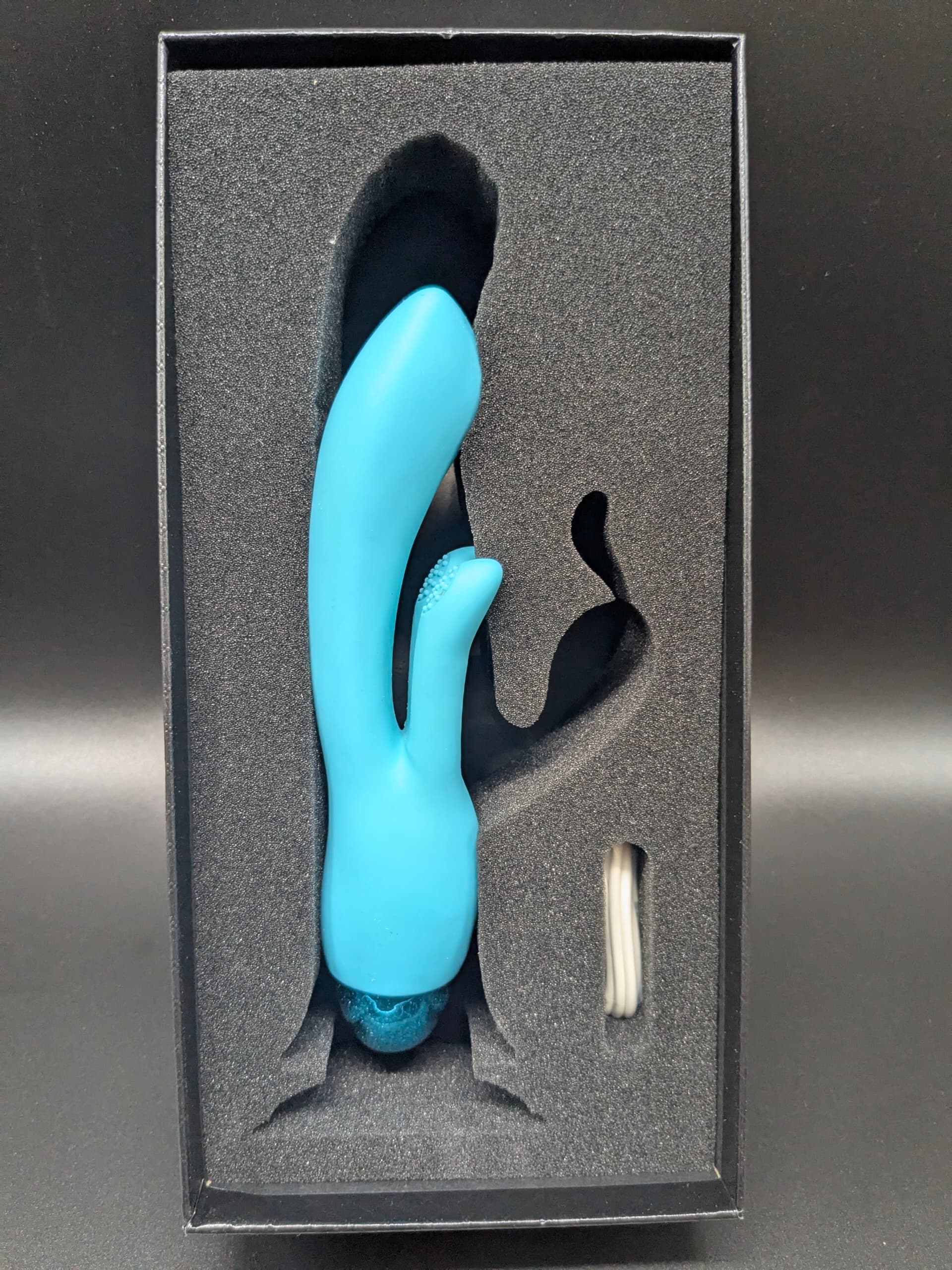 Vibrador especialista en punto G con ángulo de 35 grados. Tres potentes motores. Resistente al agua y recargable. Color cian. 35mm.